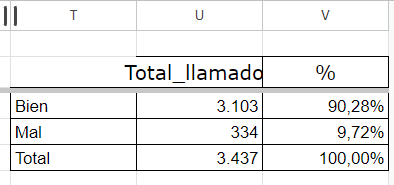After transcribing the data and verifying that they were all correct and that they did not present biases in their loading, it was concluded that the percentage of good calls was within the expected number. Of a total of 3,437 calls, 3,103 were good calls, representing a total of 90.28%. The total of bad calls was 334, which represents 9.72% of the total calls in the entire FABA tournament. Here the table from the “Datos_desempeño_Oficiales” form shows us this: